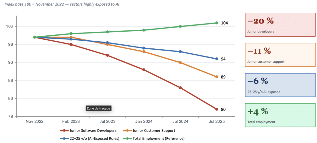 The ADP data — the most granular ever used for this type of analysis — speaks for itself: in the United States, between late 2022 and July 2025, employment among 22- to 25-year-olds in roles highly exposed to AI fell by 6%. For young software developers, the decline reached 20% compared to the peak in November 2022. Entry-level customer support roles also lost nearly 11% of their junior staff. It is the entry-level positions that are disappearing first9.