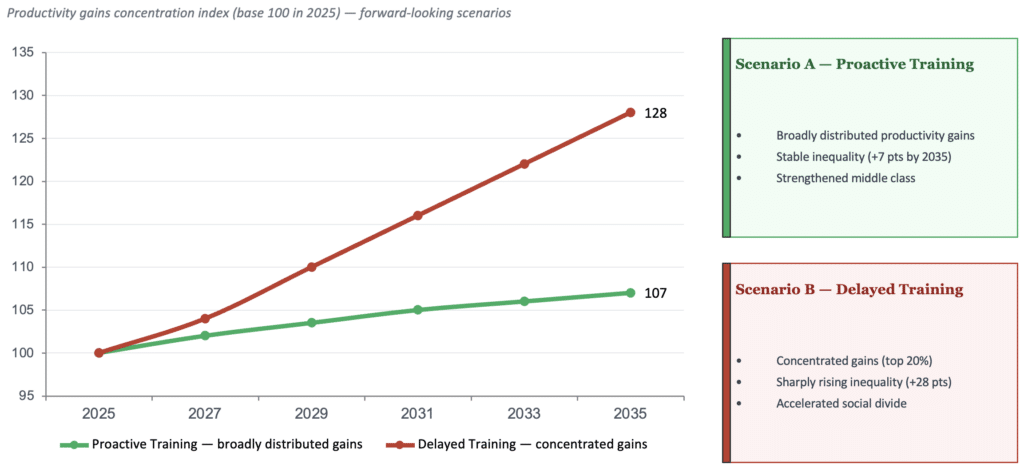 The third area of focus is financial. Companies are investing hundreds of billions in AI infrastructure — data centres, chips, foundational models. A comparable investment in human capital is not merely a moral obligation: it is the prerequisite for the model’s social sustainability. The economic scenarios for transformative AI developed in February 2026 in London, as part of a forward-looking exercise bringing together economists and policymakers around the Windfall Trust and Gresham College, illustrate this precisely: in all trajectories where productivity gains are widely distributed, investment in training has consistently preceded — or accompanied — technological deployment. The opposite is equally true: where training has been deferred, the benefits of AI have been concentrated among a few players, widening inequalities rather than reducing them24.
