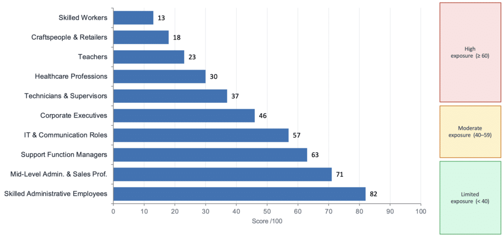 In France, the picture is similar. Projections for 2026–2030 identify several socio-professional categories that are particularly vulnerable: intermediate administrative professions, certain support function managers, and skilled office workers. France is not immune due to its social model — it is exposed, like its partners, to an accelerated restructuring of its labour market13.