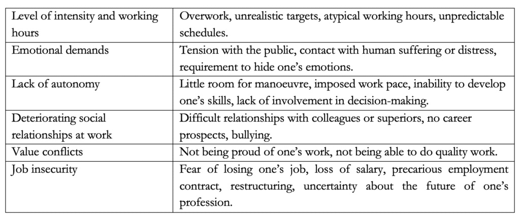 A psychosocial risk (PSR) is exposure to occupational factors which, through repetition and amplification, lead to “decompensation”, i.e. psychological deterioration in individuals. People who are exposed to poor working conditions over a long period of time may develop inappropriate coping behaviours, such as addiction to alcohol or drugs, or experience burnout. In 2011, a panel of experts commissioned by the French Ministry of Labour proposed a classification of PSRs, which is now considered reliable and serves as a framework for effective prevention2. This grid comprises six main categories, the content of which is regularly updated to take account of new risks (Table 1).