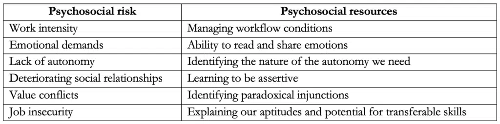 As such, methods exist to diagnose these risks within organisations3 and thus prevent them. These strategies consist of ensuring that people avoid experiencing these overwhelming situations. Beyond the problem and the risk itself, it is more important to focus on the approach to be taken and therefore the attitude to be adopted to address the issue. This attitude corresponds to a skill that can be developed by cultivating what Yves Clot, professor emeritus of occupational psychology at the Conservatoire National des Arts et Métiers, calls “Psychosocial Resources”4 (Table 2). These correspond to the conditions for a job to be done well and differentiate between being tired from meaningless work and the “healthy tiredness that comes from a job well done”. On this basis, we will review each of the risk factors and show which psychosocial resource enables a positive approach to work, when the context allows.