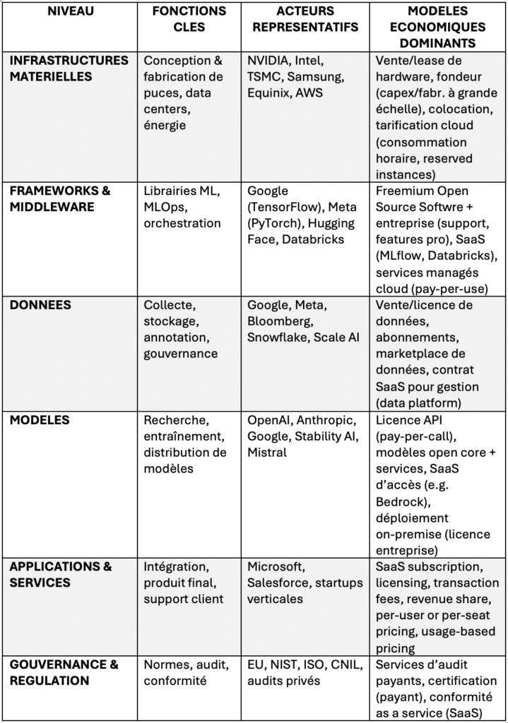 Les acteurs dominants de l’IA — principalement les grandes entreprises américaines et chinoises — se caractérisent par une stratégie d’intégration verticale : ils contrôlent simultanément les couches d’infrastructure (cloud, processeurs, réseaux), les couches d’application (outils d’IA, interfaces) et les usages finaux. Ce modèle de « plateformisation systémique » leur permet de capter non seulement la valeur générée par l’innovation, mais aussi les externalités produites par les interactions entre utilisateurs, développeurs et producteurs de données. Ces entreprises opèrent comme des architectes d’écosystèmes, fixant les règles d’accès et de partage des données, les standards d’interopérabilité et les conditions économiques de participation.