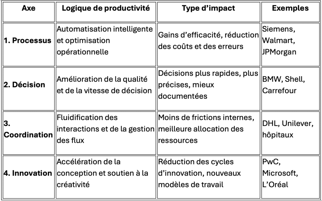 Ainsi, alors que le discours public sur l’intelligence artificielle (IA) se concentre souvent sur la disruption et le remplacement du travail humain, son effet le plus tangible dans la plupart des entreprises contemporaines réside dans l’amélioration incrémentale de la productivité. Dans les faits, l’IA agit comme un levier de rationalisation des processus, d’accélération des prises de décision, de fluidification de la coordination et d’enrichissement des capacités d’innovation. Ces transformations ne bouleversent pas nécessairement la structure de l’entreprise, mais en reconfigurent profondément les modes d’efficience interne et la création de valeur. On le retrouve dans la variété des cas d’usage existant qui fait écho à l’essor des IA verticales et sectorielles : dans la santé, la finance, le droit, l’industrie, la défense, l’énergie, la culture… Cette variété tient à la spécialisation des modèles et leur ajustement aux corpus de données et aux contraintes métiers.