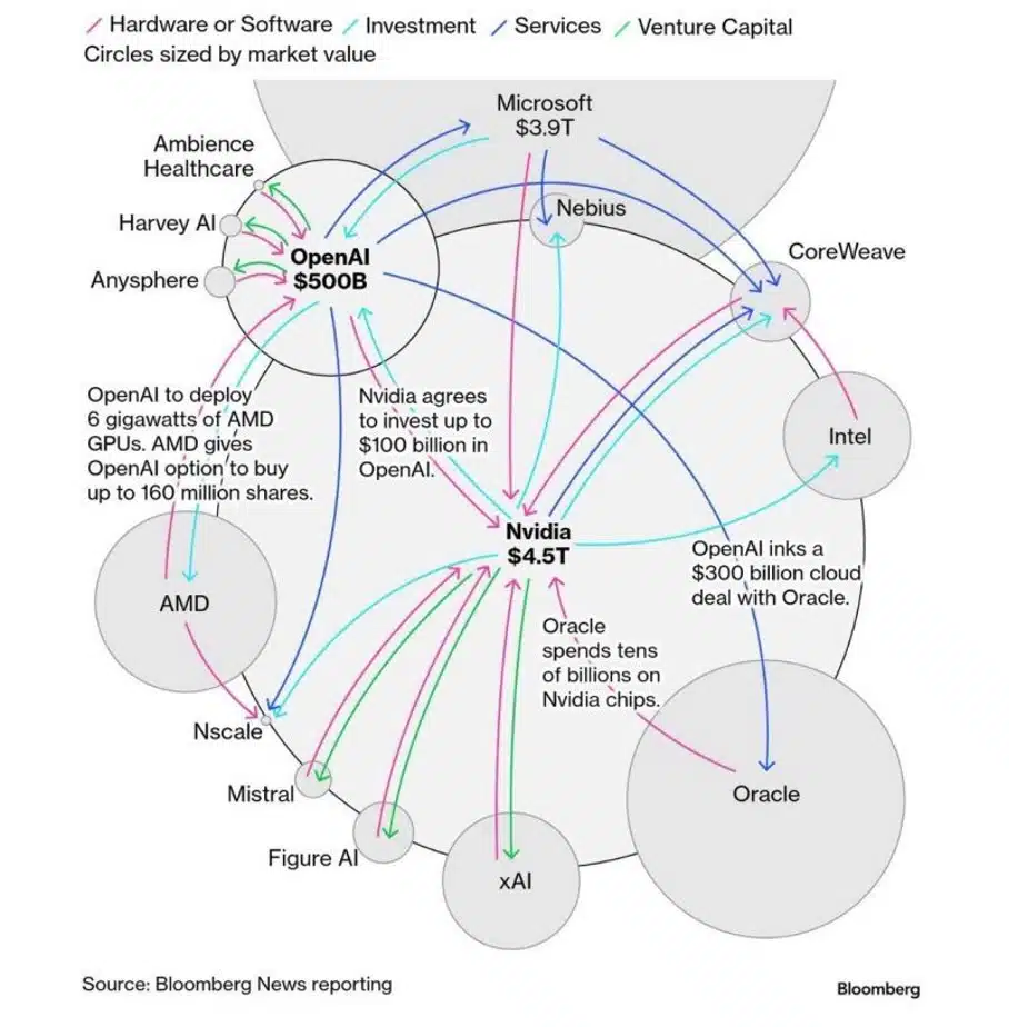 Un second phénomène tient d’un effet de bulle. Il relève d’une part d’investissements massifs dans tous les registres : Open AI envisage ainsi 10 000 milliards de $ d’ici 2033… tout en n’annonçant cette année que 13 milliards de chiffre d’affaires annualisé tout en ne prévoyant aucune rentabilité jusqu’à 2030. L’importance de ces investissements relève d’autre part de manœuvres financières qui tournent en rond avec des accords endogames (voir figure 1) et un nombre restreint d’acteurs et d’entreprises engagés dans l’IA, s’alimentant les uns les autres.