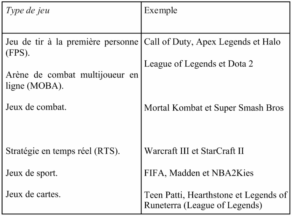 L’esport couvre la plupart des genres de jeux vidéo habituels (voir tableau 1) et repose sur des éléments clés tels que : l’interconnectivité (Internet haut débit sans contrainte de lieu physique) ; les jeux en ligne sur consoles, PC et mobiles ; les infrastructures nécessaires pour accueillir les joueurs ; et un public de masse6. L’écosystème de l’e-sport est organisé autour de compétitions professionnelles ou semi-professionnelles au sein d’une structure établie (tournoi ou ligue) avec un objectif spécifique, tel que le titre de champion ou un prix en argent.