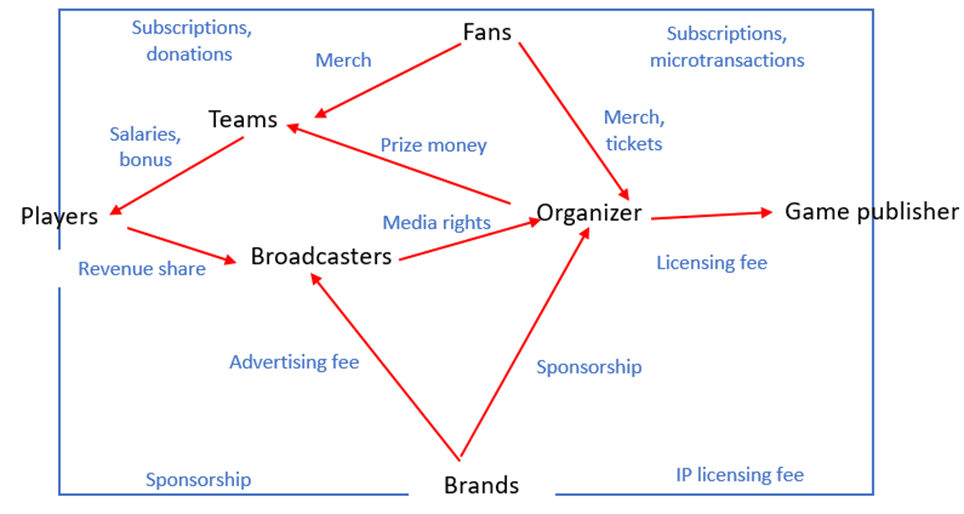 Les plateformes de streaming sont également des entreprises technologiques. Elles investissent massivement dans leurs infrastructures afin de garantir à leurs clients, où qu’ils se trouvent, l’accès à leur contenu et la même qualité de service. Les entreprises de streaming comptent sur des revenus fixes provenant des abonnements mensuels. Elles peuvent également percevoir des revenus publicitaires, soit sous forme de commissions sur les ventes de produits, soit via des programmes de partenariat et de partage des revenus sur leurs sites. Le sponsoring est une autre source de revenus. Comme ces entreprises sont des filiales de grandes sociétés technologiques, elles ont un pouvoir de négociation accru pour traiter avec les éditeurs et les organisateurs d’événements : elles peuvent conclure des accords exclusifs avec les éditeurs de titres e‑sport populaires. Par conséquent, la distribution de l’e-sport n’est pas aussi lucrative financièrement que d’autres sports, car la plupart des événements e‑sport sont diffusés via des plateformes en ligne.