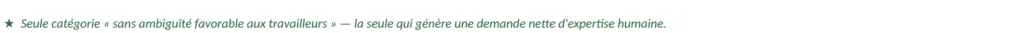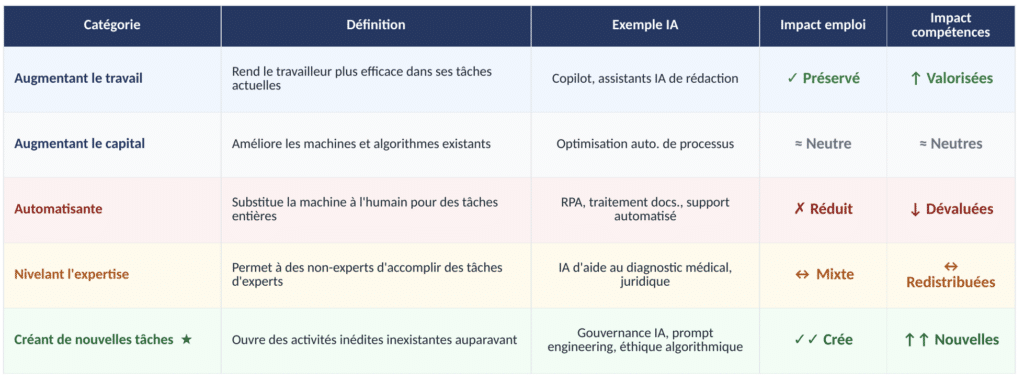 Acemoglu, Autor et Johnson affinent encore cette grille en distinguant cinq catégories de technologies, dont deux méritent attention particulière. Les technologies de « nivellement de l’expertise » permettent à des non-experts d’accomplir des tâches autrefois réservées à des spécialistes — l’IA médicale d’aide au diagnostic en est un exemple. Les technologies de « création de nouvelles tâches » sont, quant à elles, les seules « sans ambiguïté favorables aux travailleurs » : elles génèrent une demande nette d’expertise humaine en ouvrant des activités qui n’existaient pas. C’est dans cette dernière catégorie que réside la promesse la plus solide — mais aussi la plus exigeante en termes de formation — de l’IA7.