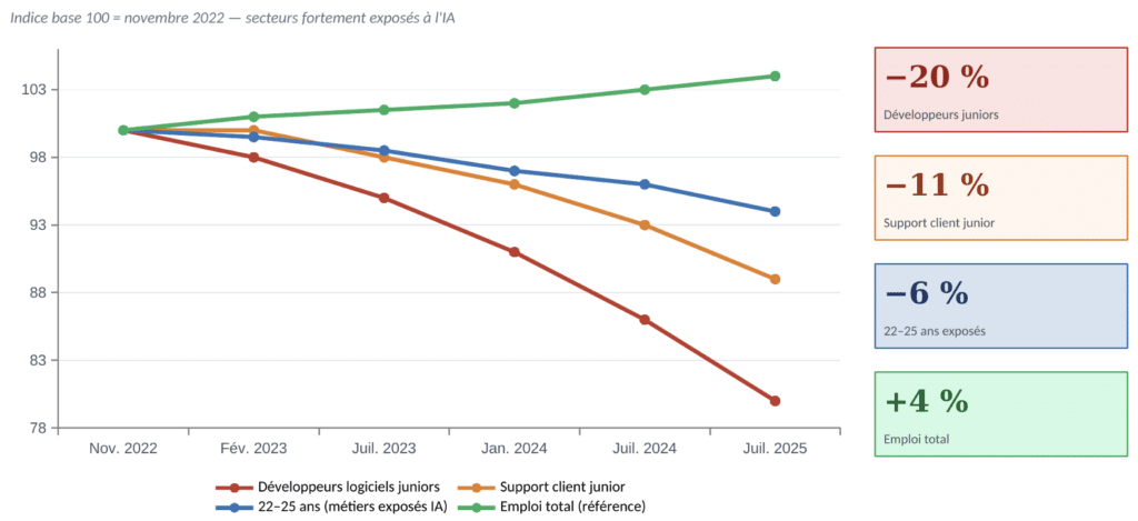 Les données ADP — les plus granulaires jamais mobilisées pour ce type d’analyse — sont éloquentes : aux États-Unis, entre fin 2022 et juillet 2025, l’emploi des 22–25 ans dans les métiers à forte exposition à l’IA a reculé de 6 %. Pour les jeunes développeurs logiciels, la chute atteint 20 % par rapport au pic de novembre 2022. Les fonctions support client d’entrée de gamme ont également perdu près de 11 % de leurs effectifs juniors. Ce sont les postes d’entrée qui s’évaporent en premier9.
