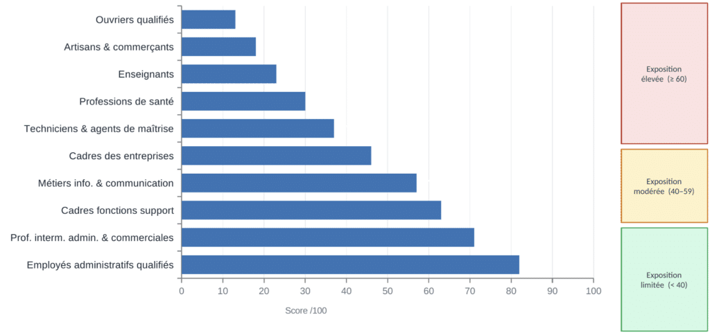 En France, le tableau est analogue. Les projections pour 2026–2030 identifient plusieurs catégories socio-professionnelles particulièrement vulnérables : les professions intermédiaires administratives, certains cadres des fonctions support, les employés de bureau qualifiés. La France n’est pas immunisée par son modèle social — elle est exposée, comme ses partenaires, à une recomposition accélérée de son marché du travail13.