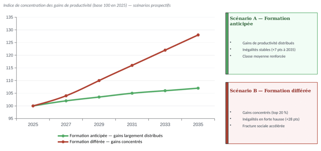 Le troisième chantier est financier. Les entreprises investissent des centaines de milliards dans l’infrastructure IA — data centers, puces, modèles de fondation. Un effort comparable sur le capital humain n’est pas seulement une obligation morale : c’est la condition de la soutenabilité sociale du modèle. Les scénarios économiques pour une IA transformatrice élaborés en février 2026 à Londres, dans le cadre d’un exercice prospectif réunissant des économistes et des décideurs autour de Windfall Trust et du Gresham College, l’illustrent avec précision : dans toutes les trajectoires où les gains de productivité se distribuent largement, l’investissement en formation a systématiquement précédé — ou accompagné — le déploiement technologique. L’opposé est tout aussi vrai : là où la formation a été différée, les bénéfices de l’IA se sont concentrés sur quelques acteurs, creusant les inégalités au lieu de les réduire24.