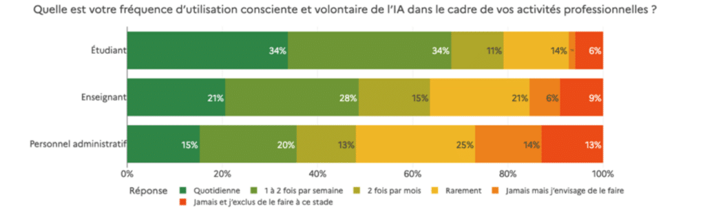 Ces avancées offrent de nouvelles opportunités pour personnaliser les parcours, renforcer le tutorat individualisé et élargir l’accès aux ressources pédagogiques. Elles soulèvent toutefois des interrogations sur les fréquences d’utilisations (voir figure 1) et les conditions cognitives de l’apprentissage assisté par IA, car certaines dimensions de l’acquisition des connaissances peuvent être fragilisées lorsque cette technologie remplace systématiquement l’effort intellectuel3.
