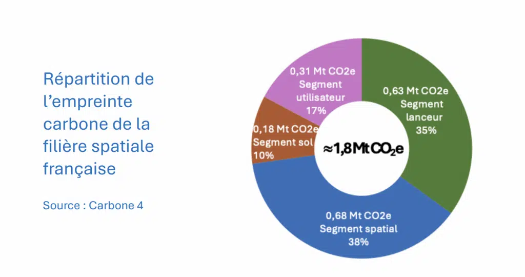 - D’après le CNES, l’empreinte carbone du secteur spatial à l’échelle nationale s’élève à 1,8 million de tonnes de CO2 équivalent, soit 0,3% des émissions nationales françaises.