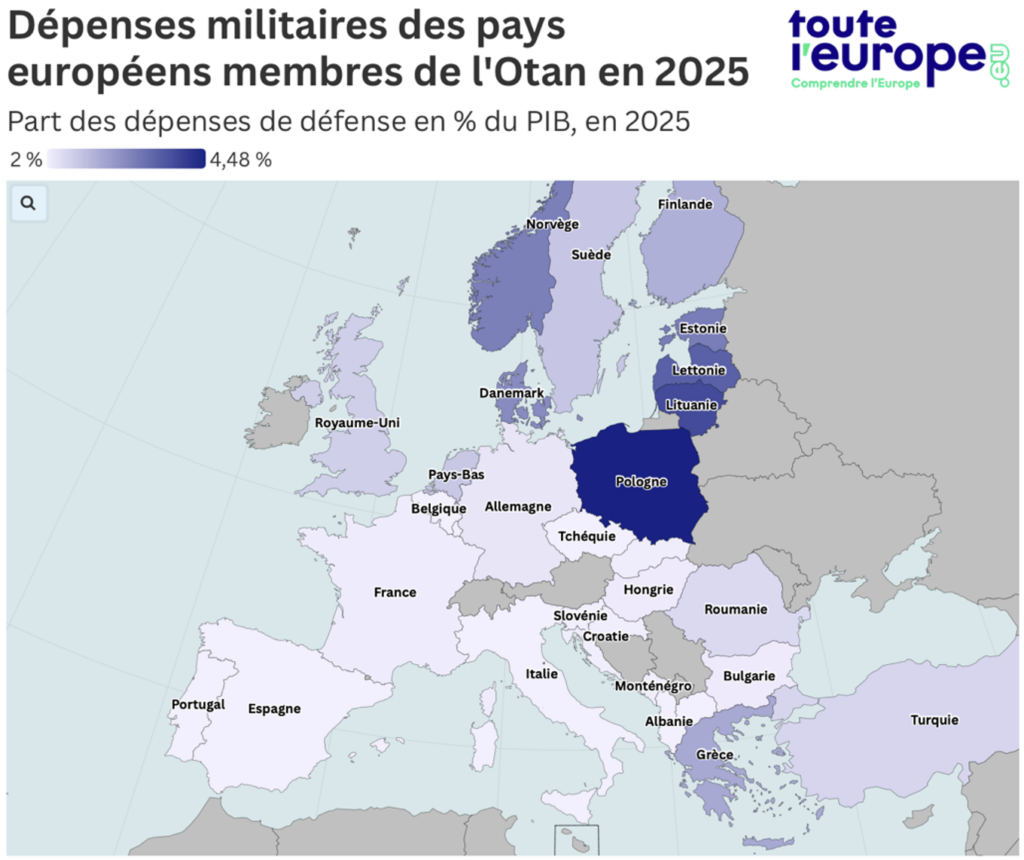 Malgré les sanctions internationales en vigueur, l’industrie russe a su sécuriser ses approvisionnements en composants électroniques stratégiques. « Un réseau d’entreprises a été mis en place, comme au Kazakhstan, afin d’importer des technologies et ainsi contourner sans grande difficulté les embargos ». Sur le plan budgétaire, 6% du PIB russe est désormais consacré à la défense. En comparaison, la Pologne est en tête du classement pour les dépenses militaires (4,48 % du PIB national), suivi des États baltes (Lituanie 4 %, Lettonie 3,73 %, Estonie 3,38 %), quant à la France, elle dépasse de peu la barre des 2% du PIB. Les dépenses militaires cumulées des 32 pays de l’Otan ont augmenté pour atteindre conjointement les 1 588 milliards de dollars en 2025.