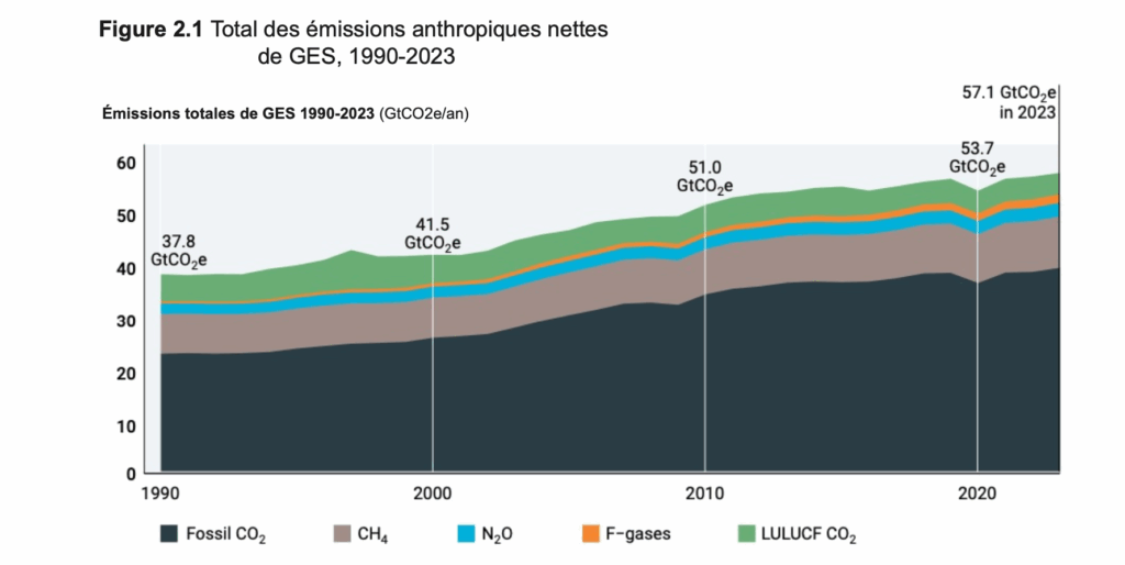 La température moyenne au cours de la dernière décennie s’élevait déjà à 1,1 °C de plus qu’à la période préindustrielle3. Soyons clairs : si de « bons élèves » sont présentés dans cet article, la trajectoire d’atténuation est encore loin de répondre aux objectifs de l’Accord de Paris. En 2023, les émissions de gaz à effet de serre (GES) atteignent un nouveau record après des années de croissance : 57,1 milliards de tonnes de CO2 équivalent (une unité prenant en compte l’ensemble des GES4). Les projections montrent que les politiques actuelles sont compatibles avec un réchauffement de 2,7 °C à 3,1° C d’ici 2100, selon les estimations5. Dans un scénario optimiste où les États tiennent l’ensemble de leurs promesses (déclarées dans leurs contributions déterminées au niveau national et leurs engagements pour la neutralité carbone), le réchauffement atteindrait 1,9 °C d’ici la fin du siècle.