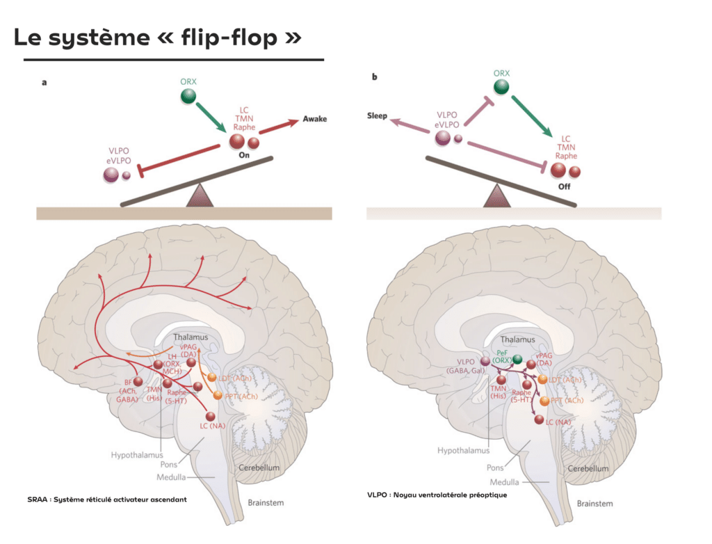Pour comprendre comment l’on devient insomniaque, il est intéressant de plonger dans les mécanismes cérébraux à l’origine de ce trouble de l’hyper-éveil. À vrai dire, pour notre cerveau, dormir signifie presque éteindre l’interrupteur. Ce mécanisme est d’ailleurs représenté à l’aide d’un système dit de « flip-flop3 », comme une bascule, des groupes de neurones interagissent entre eux pour soit s’activer, soit s’inhiber. D’un côté de la bascule, nous pouvons dire que nous sommes en mode éveil, de l’autre en mode sommeil.